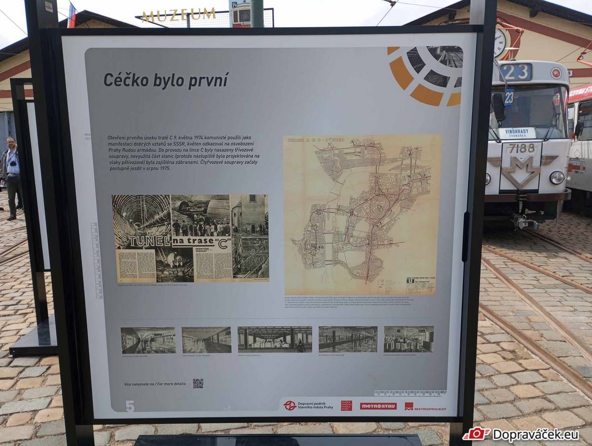 Putovní výstava bude k vidění do poloviny srpna na osmi různých místech v Praze. Výstava má 20 panelů a je společným projektem DPP, hl. m. Prahy, tehdejšího projektanta a zhotovitele, společností METROPROJEKT Praha a Metrostav.