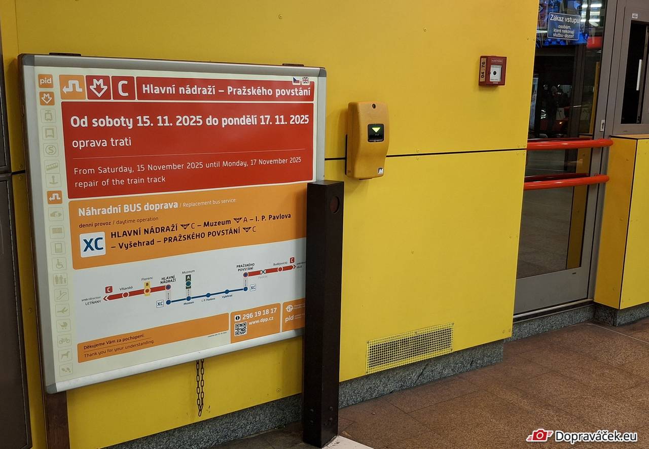 Od soboty 15. listopadu do pondělí 17. listopadu 2025 bude obousměrně přerušen provoz metra na lince C v úseku Hlavní nádraží – Pražského povstání.